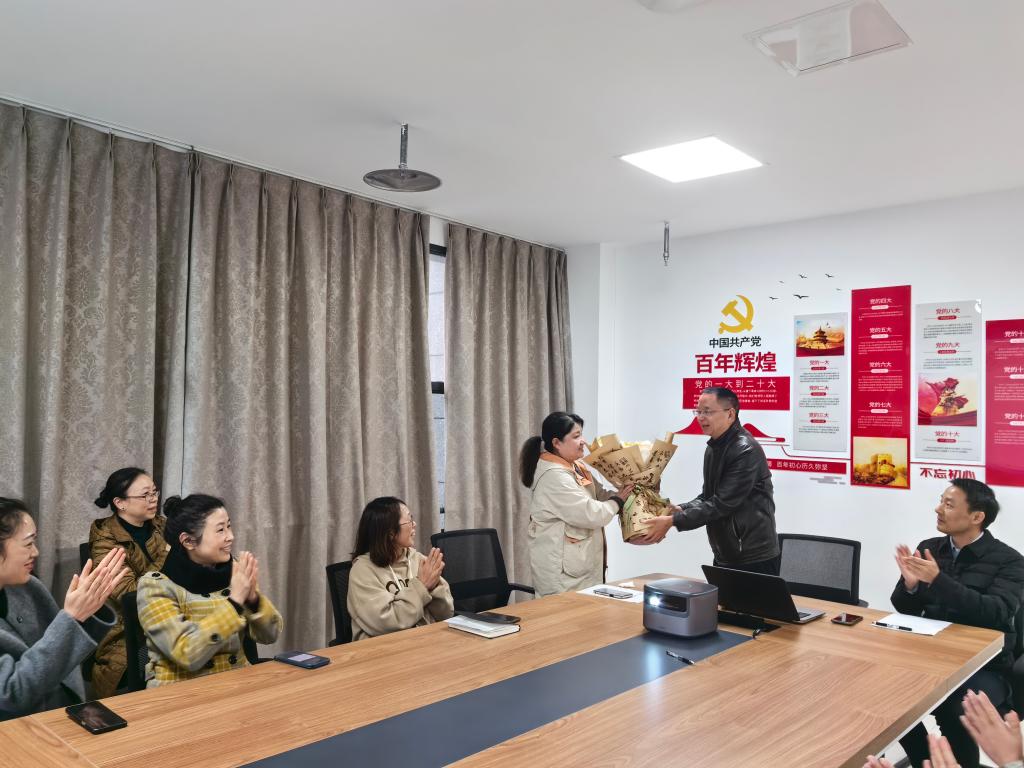 在荣退仪式的尾声,胡均国代表全体同事向程红燕同志赠送鲜花,祝福她生日快乐,开启幸福美满的人生新篇章。