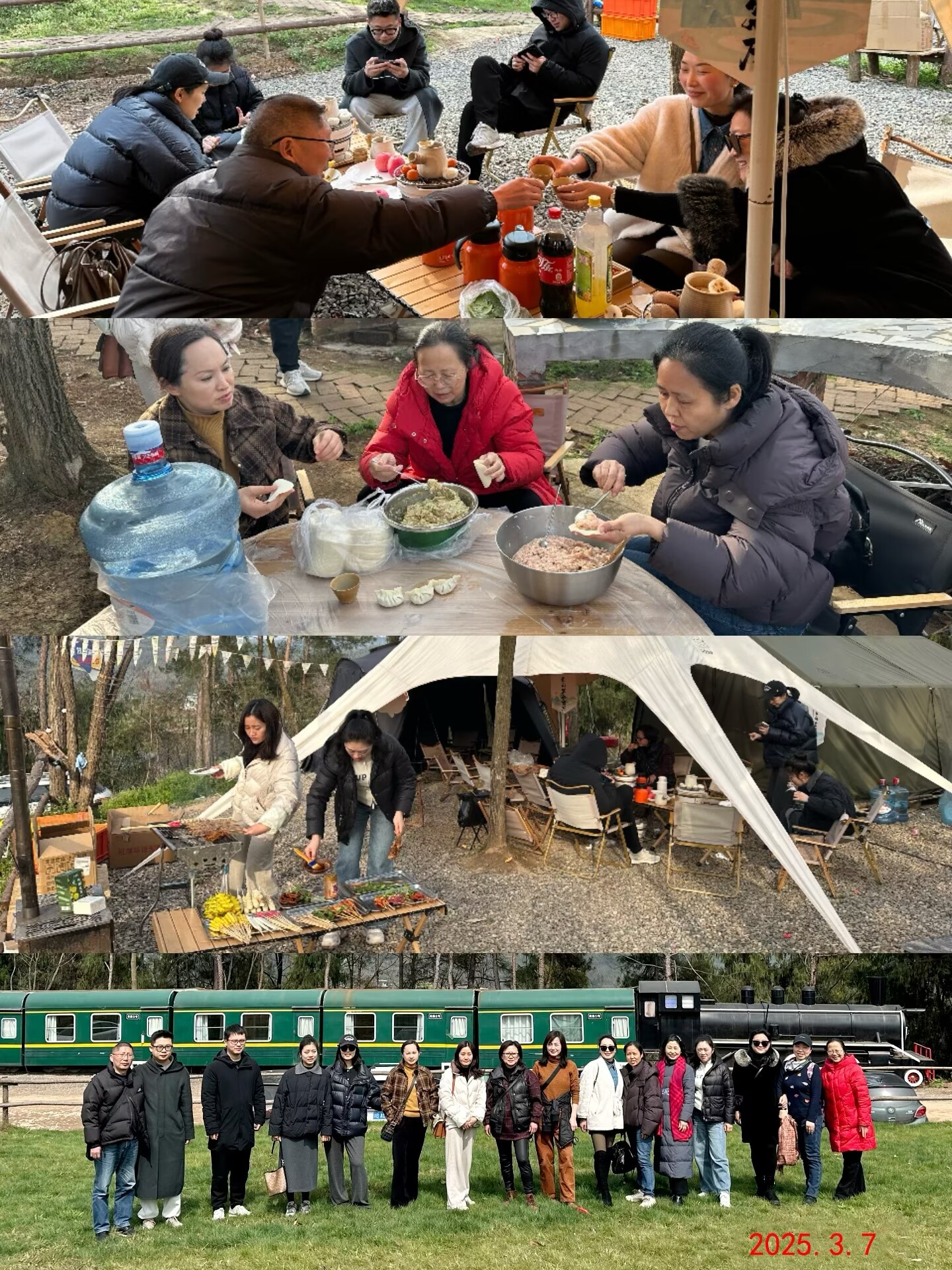 晚餐时分,充满生活气息的包饺子和烧烤活动开始了。大家分工协作,有的调馅、包饺子,动作娴熟,不一会儿,形态各异的饺子摆满了餐桌;有的在烧烤架旁烤制美食,刷油、翻面、撒调料,肉香、菜香交织在一起,香气四溢。大家一边品尝着自己的劳动成果,一边交流厨房技艺,气氛其乐融融。